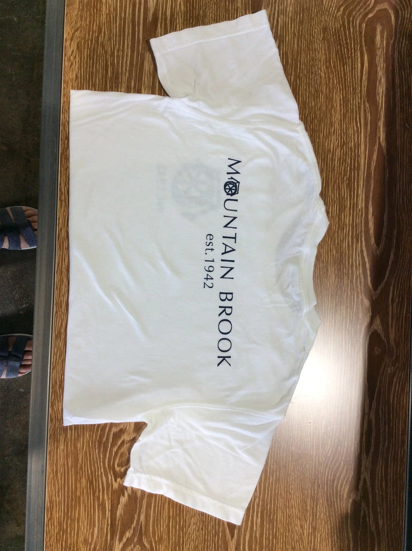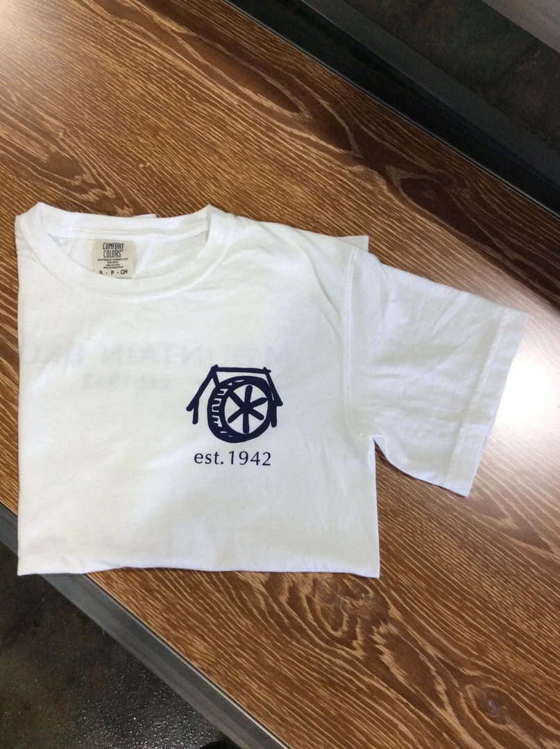 White, Comfort Colors short sleeve t-shirt, with navy Mountain Brook Old Mill and “est. 1942” on the front and “Mountain Brook est. 1942” in navy on the back.