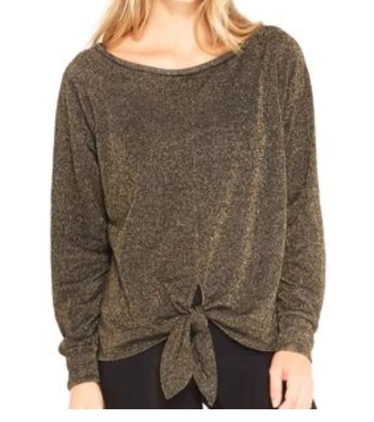 This Gold Shimmer Knit Tie Front has some serious mettle: Designed in a beautiful fabric with a muted yet stylish shine, this top is flowy yet flattering with a fashion-forward tie in the front. Pair it with leggings or jeans and boots and you’re good to go, go, go. Made in the USA.