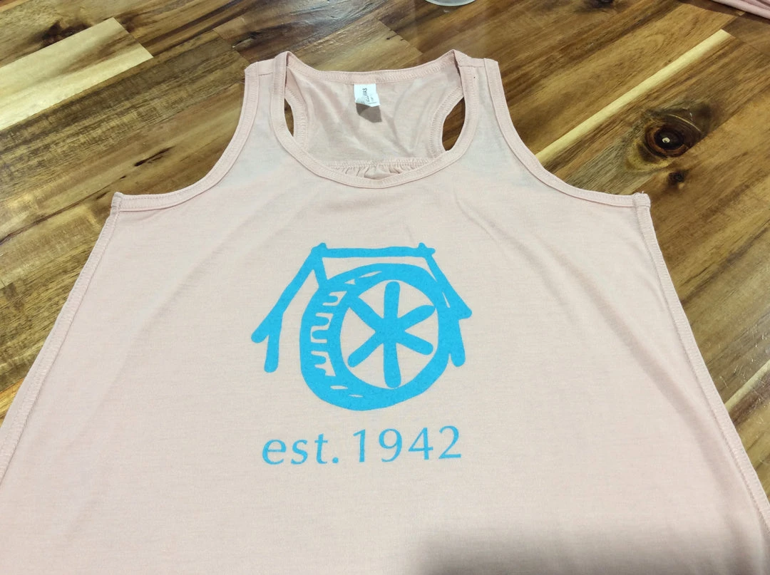 Soft, blush, youth tank with turquoise lettering “Mountain Brook est. 1942”