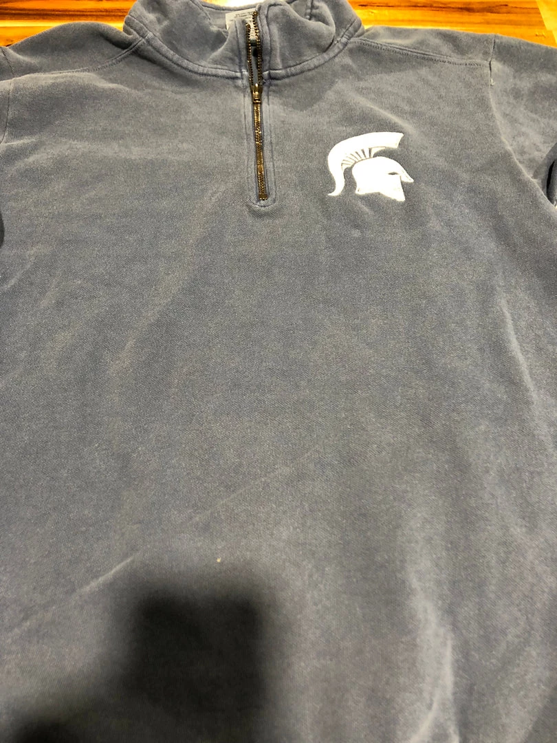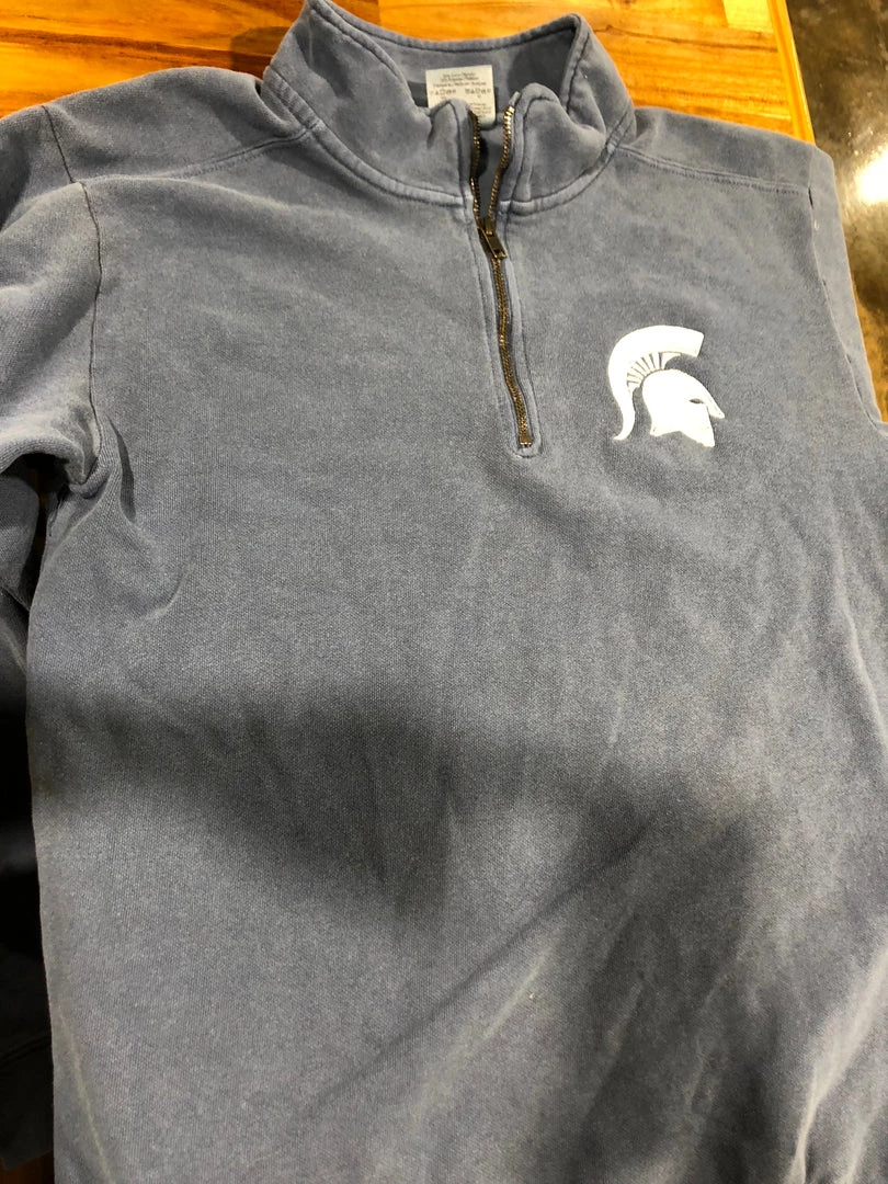 Comfort Color Denim Blue 3/4 Zip pullover with White embroidered Spartan Head.
