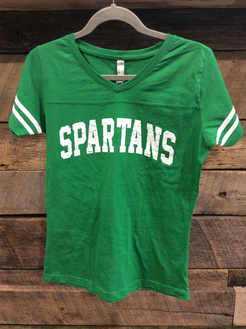 Cheer your Spartans on in this super fun green, varsity style, short sleeve, v-neck women’s t-shirt. Â Decorated with Spartans in large, distressed font across the front.