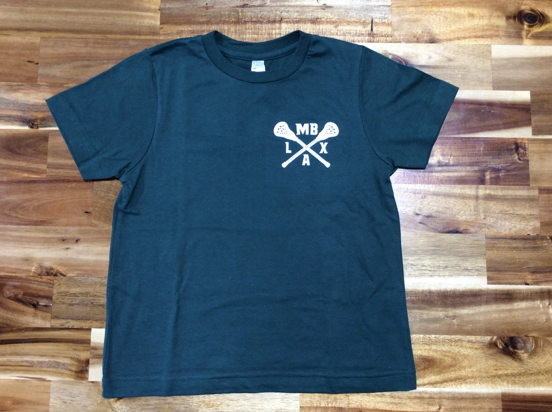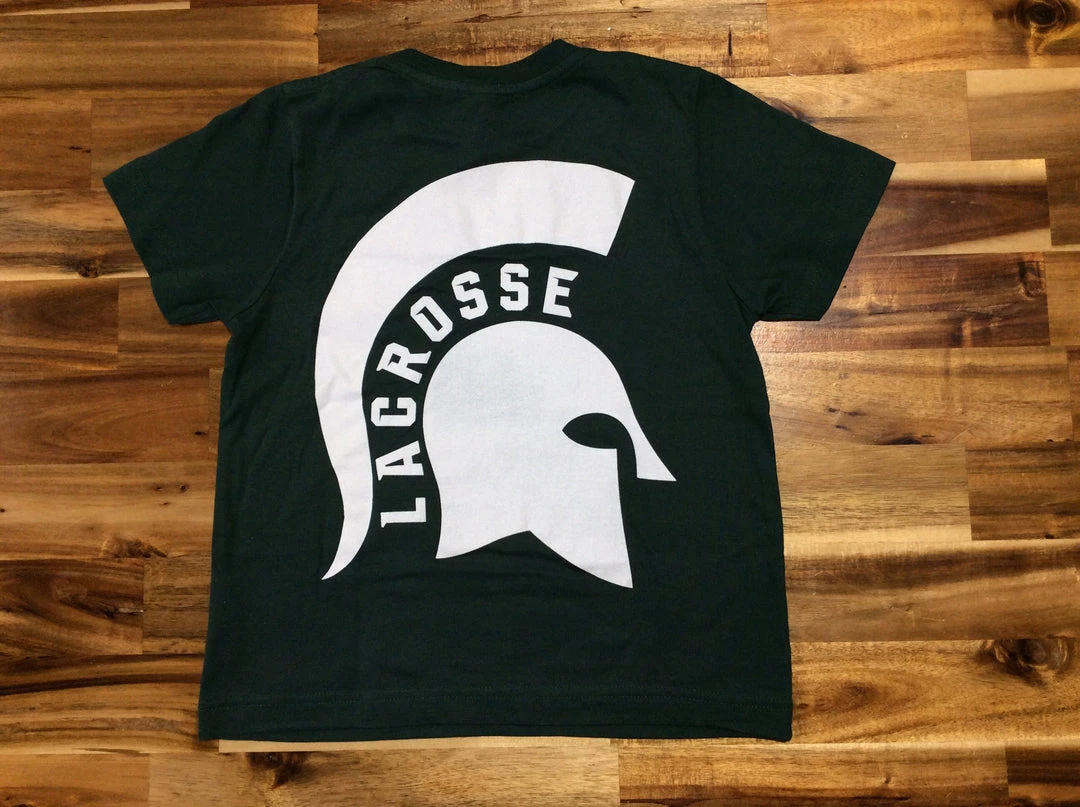 Super soft Spartan green lacrosse t shirt. Â 100% cotton. Large spartan head on the back, MB LAX with crossed lacrosse stick on the front of the shirt (top left corner).
