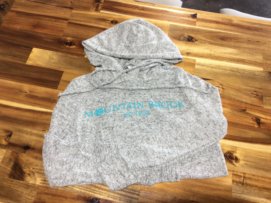 Super soft heathered gray hoodie with “Mountain Brook Est. 1942” screen printed on the front in teal lettering.
