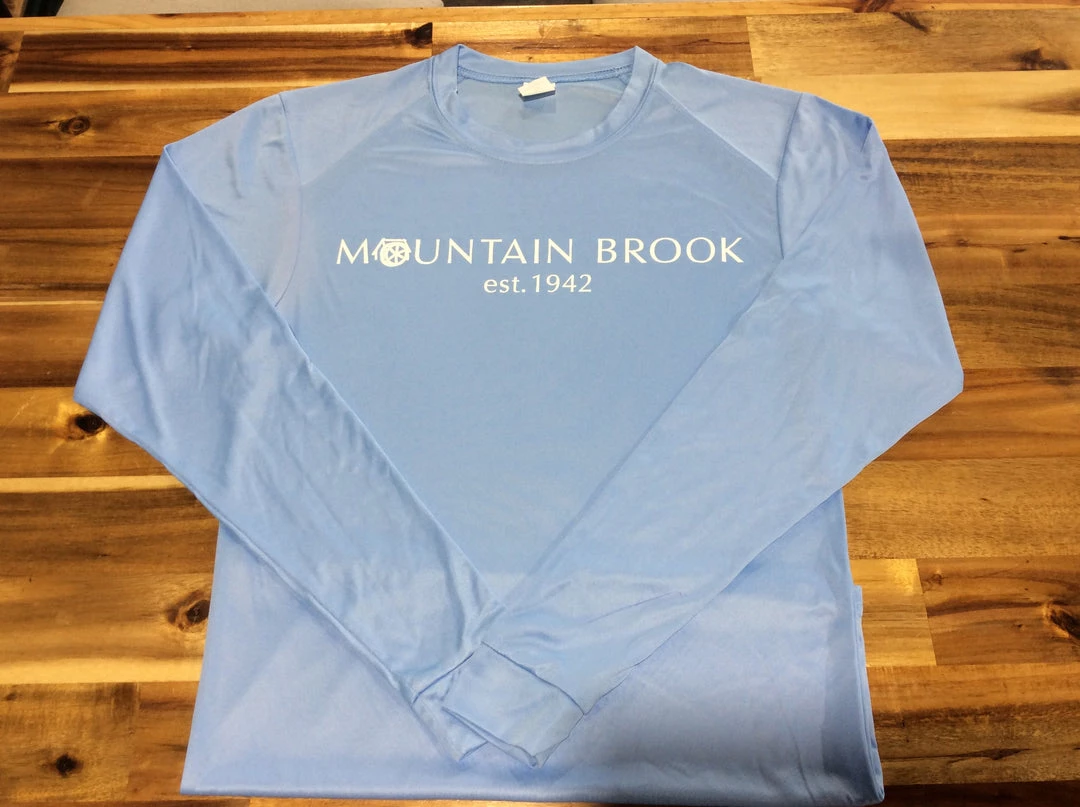 Silky soft, long sleeve, powder blue t-shirt with “Mountain Brook est. 1942” on the front in white lettering and the city GPS co-ordinates on the back.