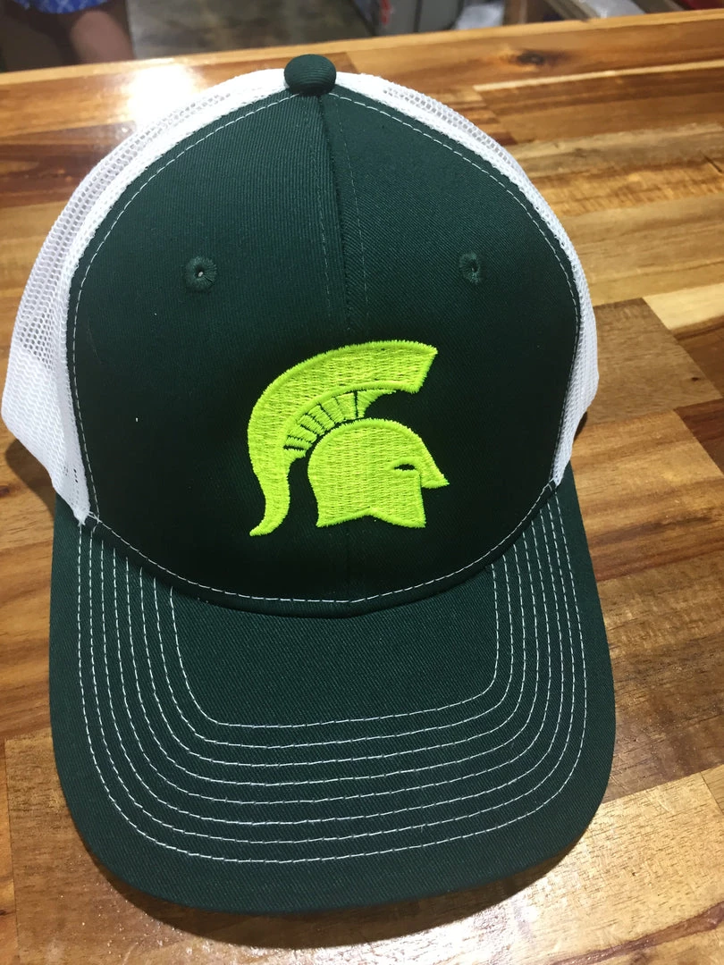 Neon Spartan Logo on Green Baseball Cap with White Mesh Backing/ White Spartan Logo on Green Hat with Mesh Backing