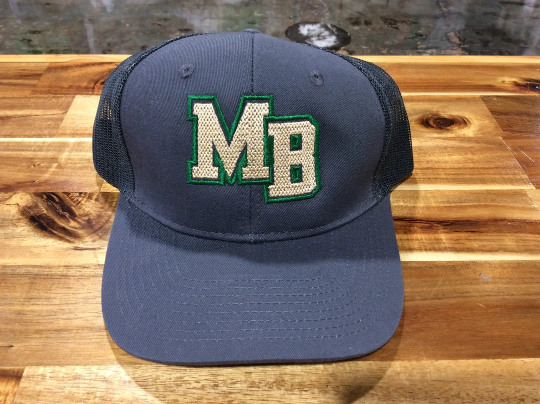 Gray on gray ,mesh back ,baseball cap with stacked MB in gold with green trim.