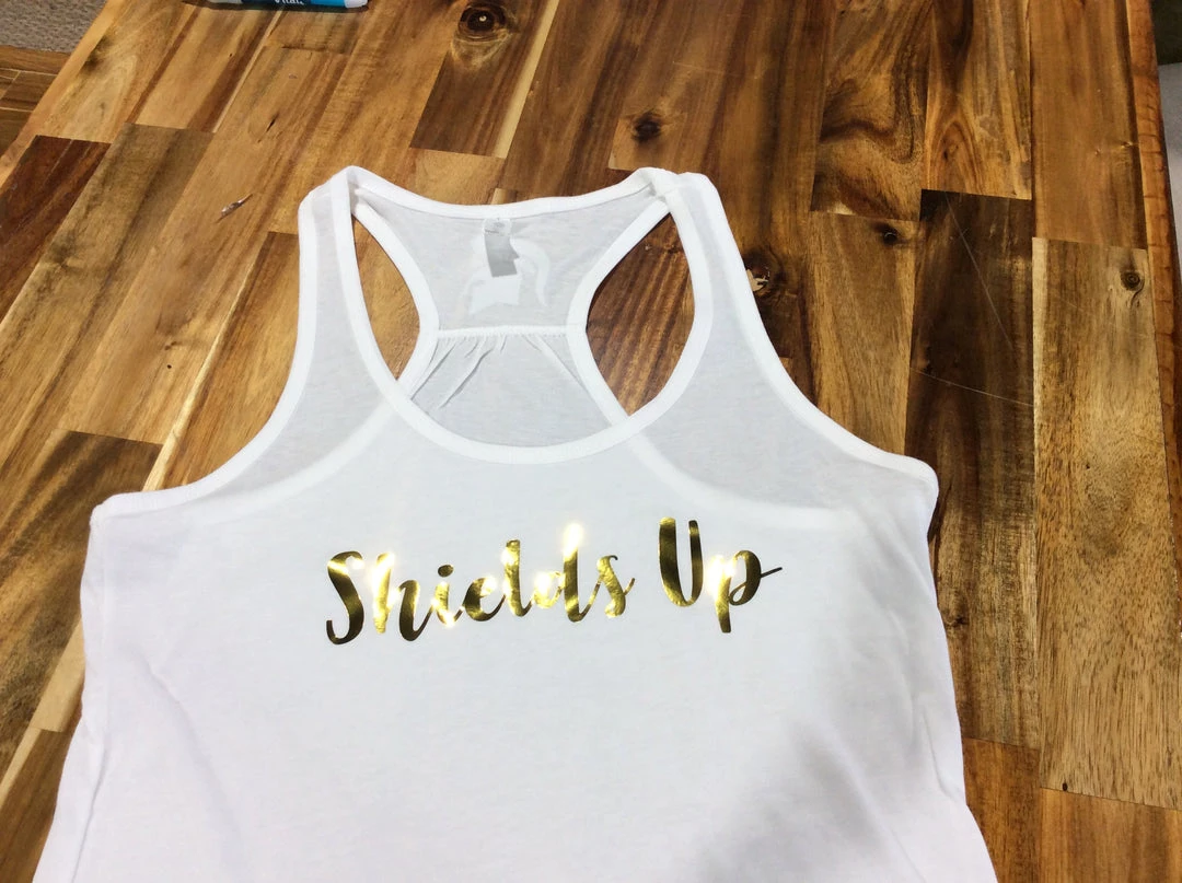 Bling it up in your Spartan Pride tank. Racer back soft white tank with shiny gold script “Shields Up” on the front and a shiny gold spartan head on the upper back.