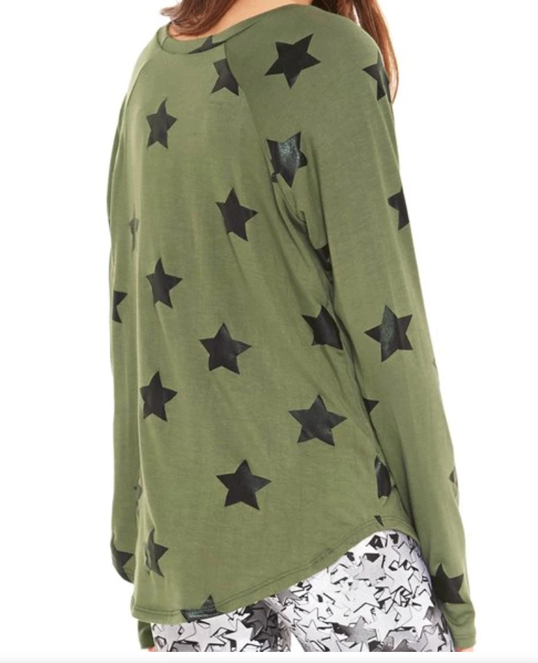 Get ready to see stars — and they’ll look great on you. This Army Green Stars Foil Long Sleeve Baseball — featuring our trademark foil technology to add some shine — is the comfy top that’s sure to land a starring role in your wardrobe. And with thumb holes and a gorg olive background, this top is a home run. Made in the USA.Â