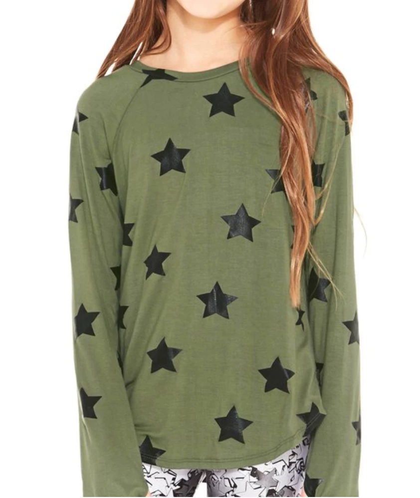 SKU: youth-apparel-1483588796491 Categories: APPAREL, YOUTH APPAREL Tags: Army Green with Stars, Black stars, Long sleeve baseball top, Long sleeve top, Star foils, Terez, Terez girls
